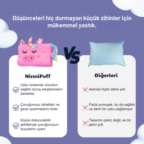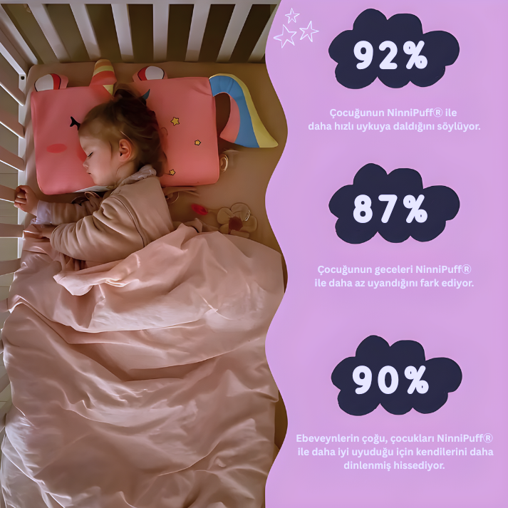 💡 Erişkin yastıkları çocuklar için fazla yüksektir. NinniPuff ise miniklerin vücut oranlarına uygun tasarımıyla güvenli ve doğal uyku sağlar.